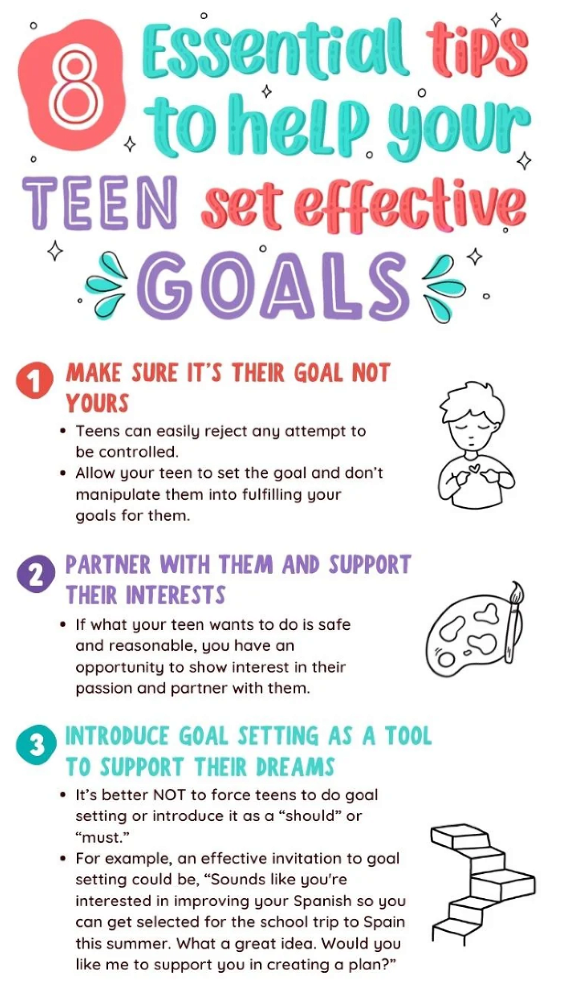 Goal setting for teens can be daunting: teens have big ideas and big dreams but don’t yet have the experience of breaking down and organizing a goal into steps. Goals like “Get an A-plus in all of my classes” or “Save enough money for a car” can end in disappointment or abandonment.