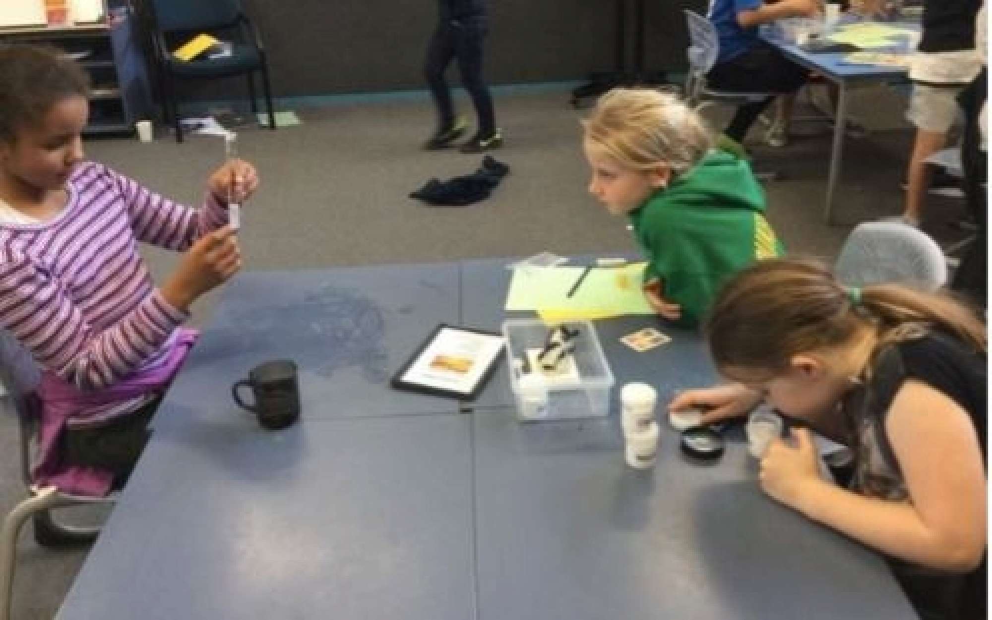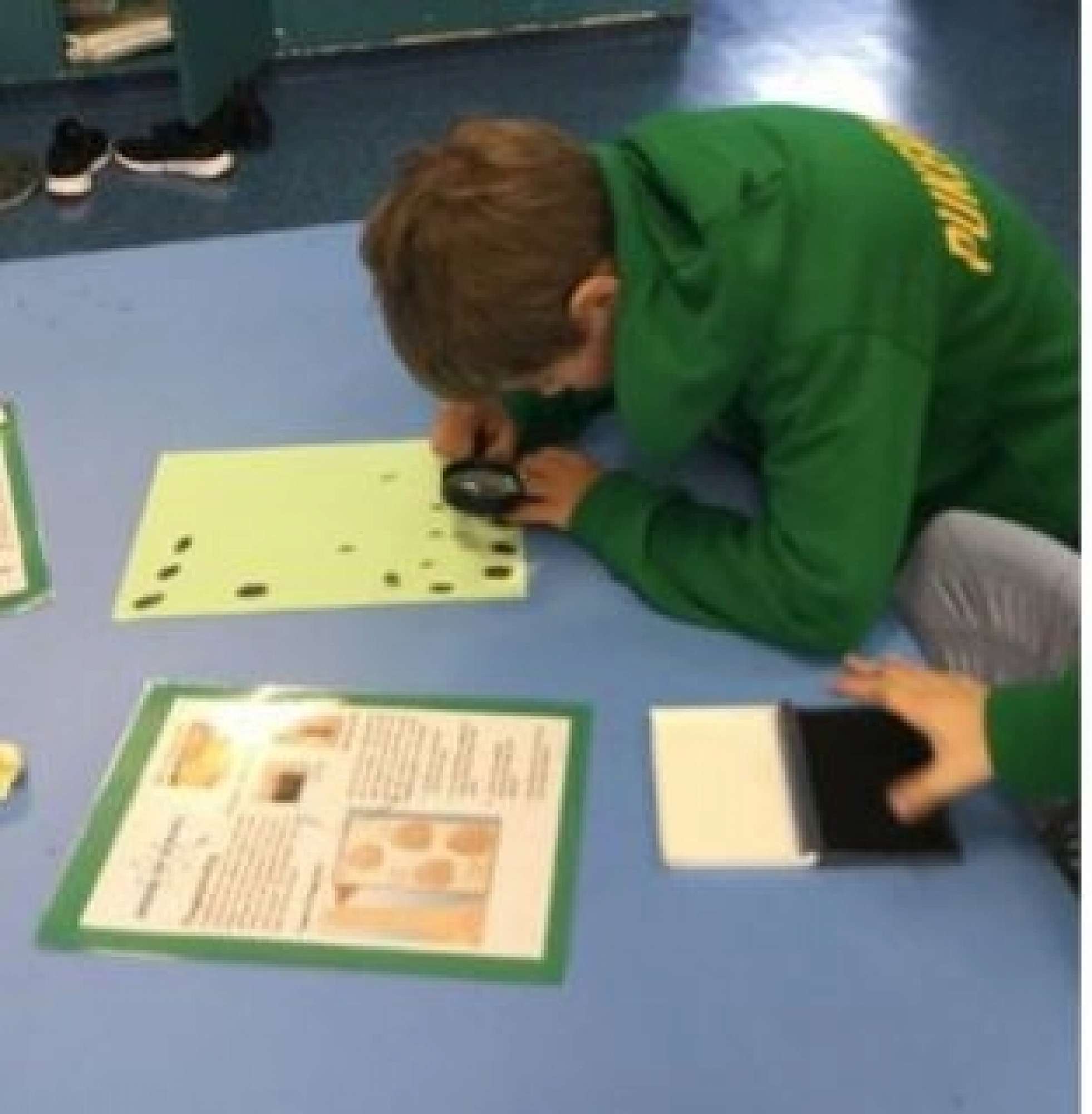 Next the students looked at fibre samples using a microscope. They found fibres had different characteristics. “I saw black spots on the wool,” said Ava. “The black t-shirt material looked like hair,” said Stella. “The wool looked like a spider,” said Cole.