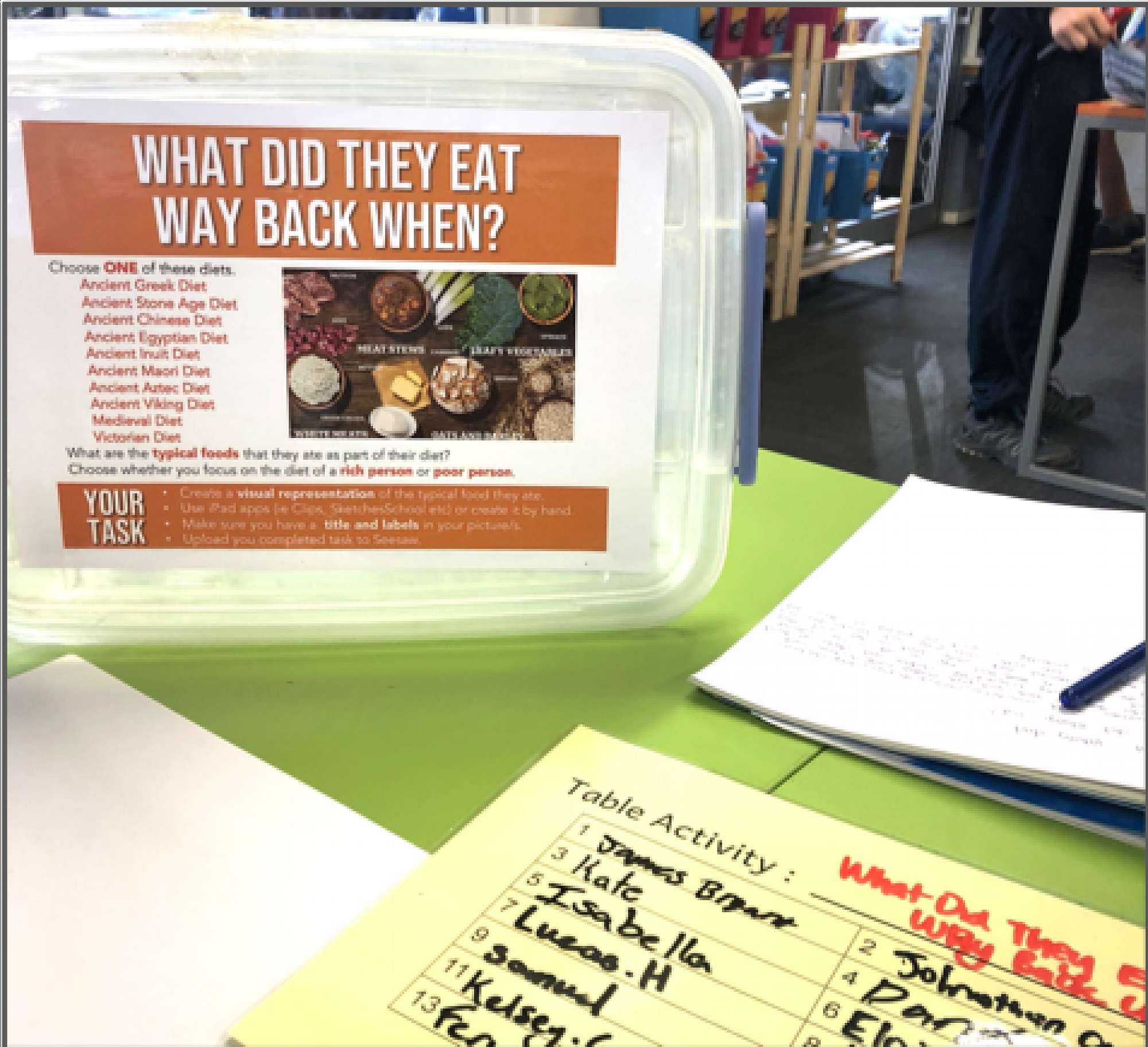What: Learning artefacts to support an activity are stored in a container that also acts as a display advertising the activity. Students self select the learning and manage time to complete a number of tabletop activities within a negotiated time