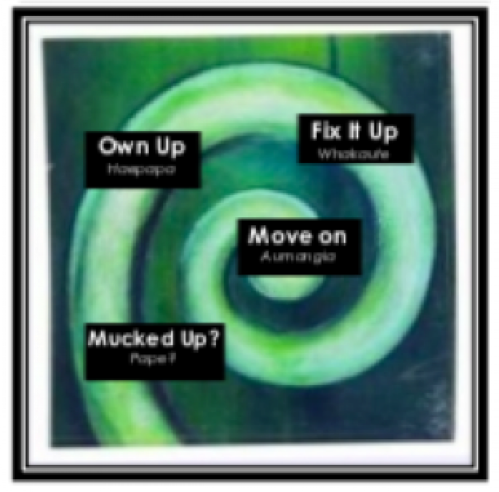 The Koru represents our Restorative process . It has four stages - Messed up? Own up, Fix up and Move on.