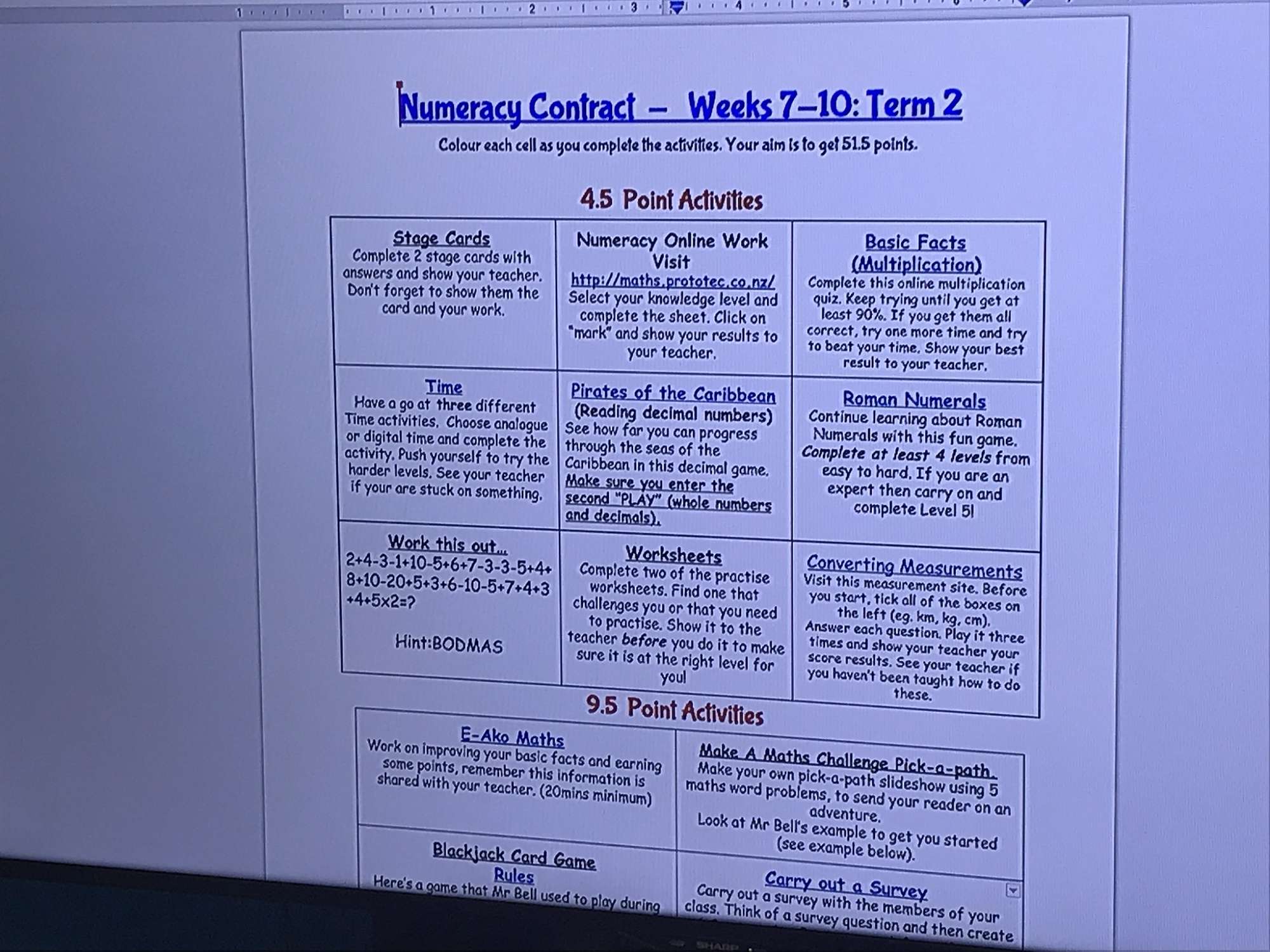 What: Numeracy contracts were being completed by year 5-6 students at Rangiora Borough School. Students have to complete activities for points and then colour them in once they’ve got a task completed and checked by a teacher. Different activities are worth different numbers of points and students can select based on their interest or the amount of challenge they want. Some activities are just laminated worksheets that they go and collect, some involve online games, higher points activities tended to involve some sort of creative element (designing and carrying out a survey, creating a maths pick-a-path etc). These usually last 3-4 weeks at RBS.