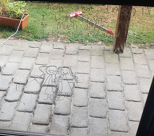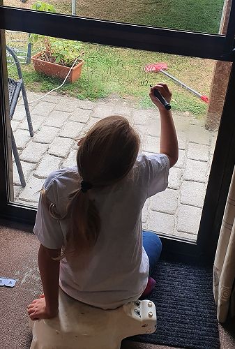 Azalea (Room 13) watched Frozen II, then wrote some words from the movie, put them into a sentence, followed by a picture on the window (in whiteboard marker).
