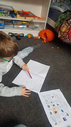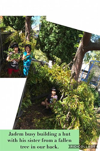 Ollie from Room 8 has been hut building, making patterns for maths, Story writing and exercising to GoNoodle!
