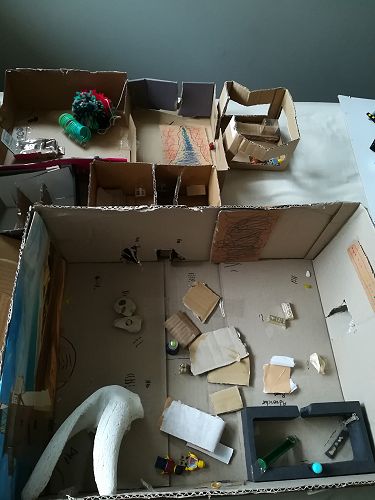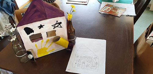 Rubi from Room 13 wrote Instructions for her underwater volcano experiment.Bradley from Room 8 is in his blanket hut with his brother and cat.Tilly has made a house out of construction materials for the elves from The Elves and the Shoemaker.