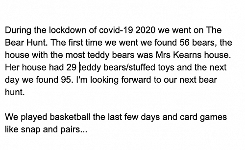 Liam from Room 10 has been using his Chromebook to practise his writing using Google Docs. He has written about CoVid-19 and all the teddy bears that Mrs Kearns has at her house....Wow!