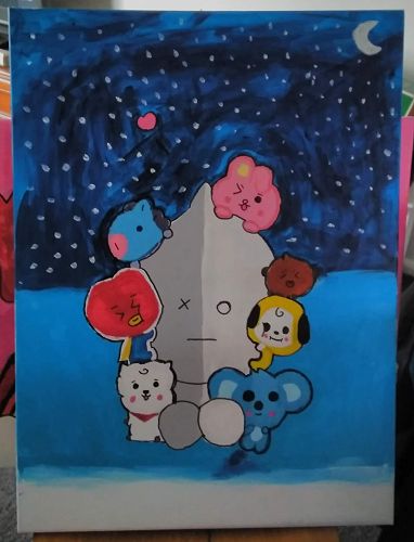 Charlie has been working on a painting, here is her explanation: the characters are from something called bt21 in the middle is a character called van, the blue one is called koya, the white one is RJ the red one is tata, next is mang then the pink one is kookie, the brown one is shooky then chimmy. I had fun working on it.