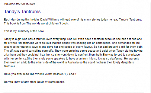 Carma, from Room 23, has been hard at work making hair scrunchies. We look forward to seeing how the scrunchies turn out! It looks like Chopper the dog is enjoying having Carma home for extra cuddles! Maia has continued blogging at home. Most recently she has written a great summary of Tandy’s Tantrums read by David Williams. Remember, you too can hear these stories for free by visiting the following link https://www.worldofdavidwalliams.com/elevenses/