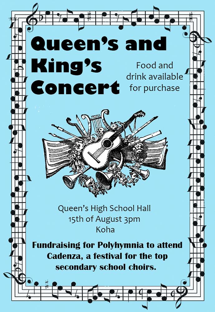 This concert will feature performances from Polyhymnia, Queen B and the Swing Kings Jazz Band and the combined King’s and Queen’s Orchestra. Entry is koha, so please come along and support the group. Food and Raffle tickets will also be available for purchase so please bring some cash. We can’t wait to see you there!