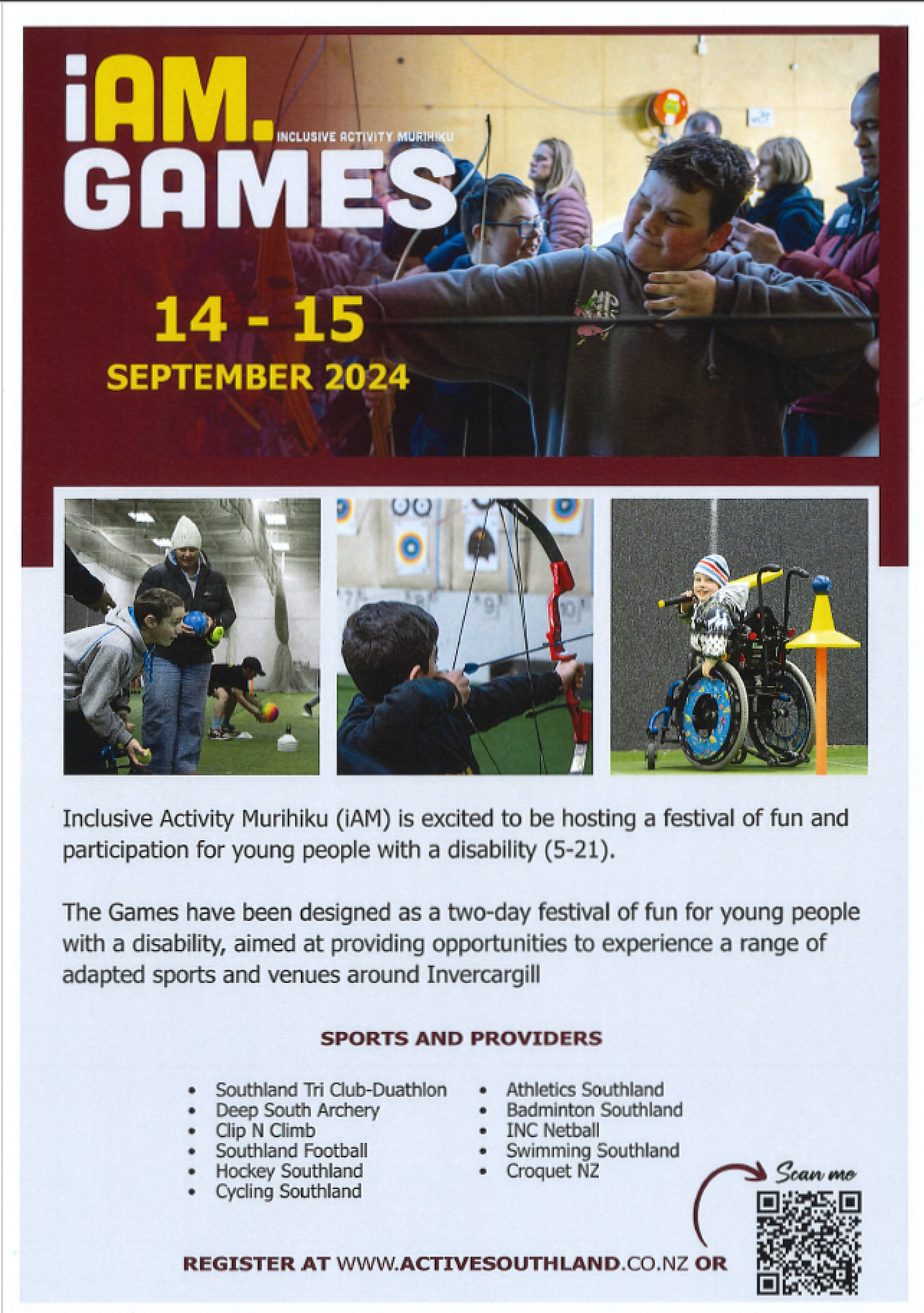 Below is the link to the registration page and also the iAM (Inclusive Activity Murihiku) facebook page. If you are interested in attending, please email Tessa at sport@queens.school.nz and make sure to register using the link below.