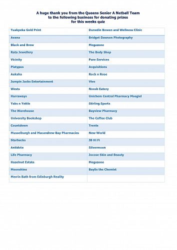 Thank you to the following local businesses who supported our Quiz Night Fundraiser for the Senior A Netball Team to go to the South Island Secondary Schools Tournament in Timaru. It was a wonderful night and we really appreciate your support.