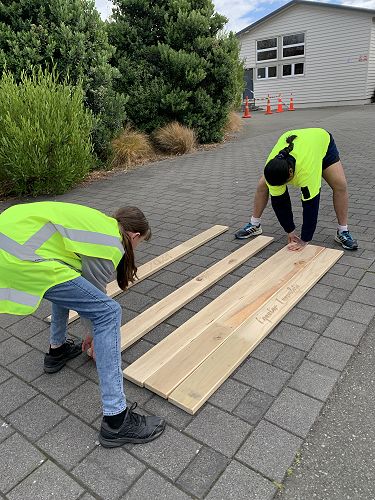Mearns and Leckie - who pre-cut the timber (supplied by PlaceMakers) and routed the tables with the names of lead students in the group.