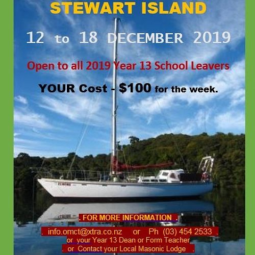 Visit this articleApplications are now open. To be held on Stewart Island between 12 Dec -18 Dec 2019. Open to all Year 13 Students. The cost is only $100 for 6 Days onboard the Yacht “Elwing”. Sailing, Snorkeling, Canoeing, Bush Tramping, Beach Fossicking. Email; info.omct@xtra.co.nz for details. Applications close Friday 4 October 2019