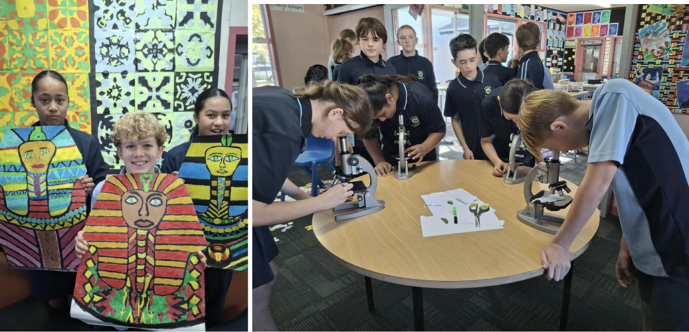 In Science and Technology, we explored innovations such as Chinese paper making and Roman aqueducts. Art sessions focused on mummies and sarcophagi, utilizing batik resist techniques. Meanwhile, Social Sciences compared ancient and modern architecture.