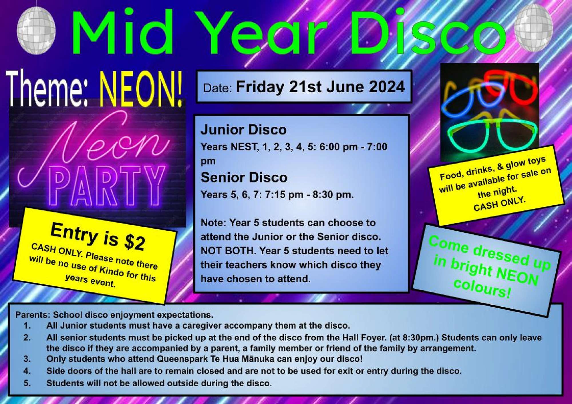 This mid-year disco is organised by our Student Council with the support of the PTA. This year the theme is neon.