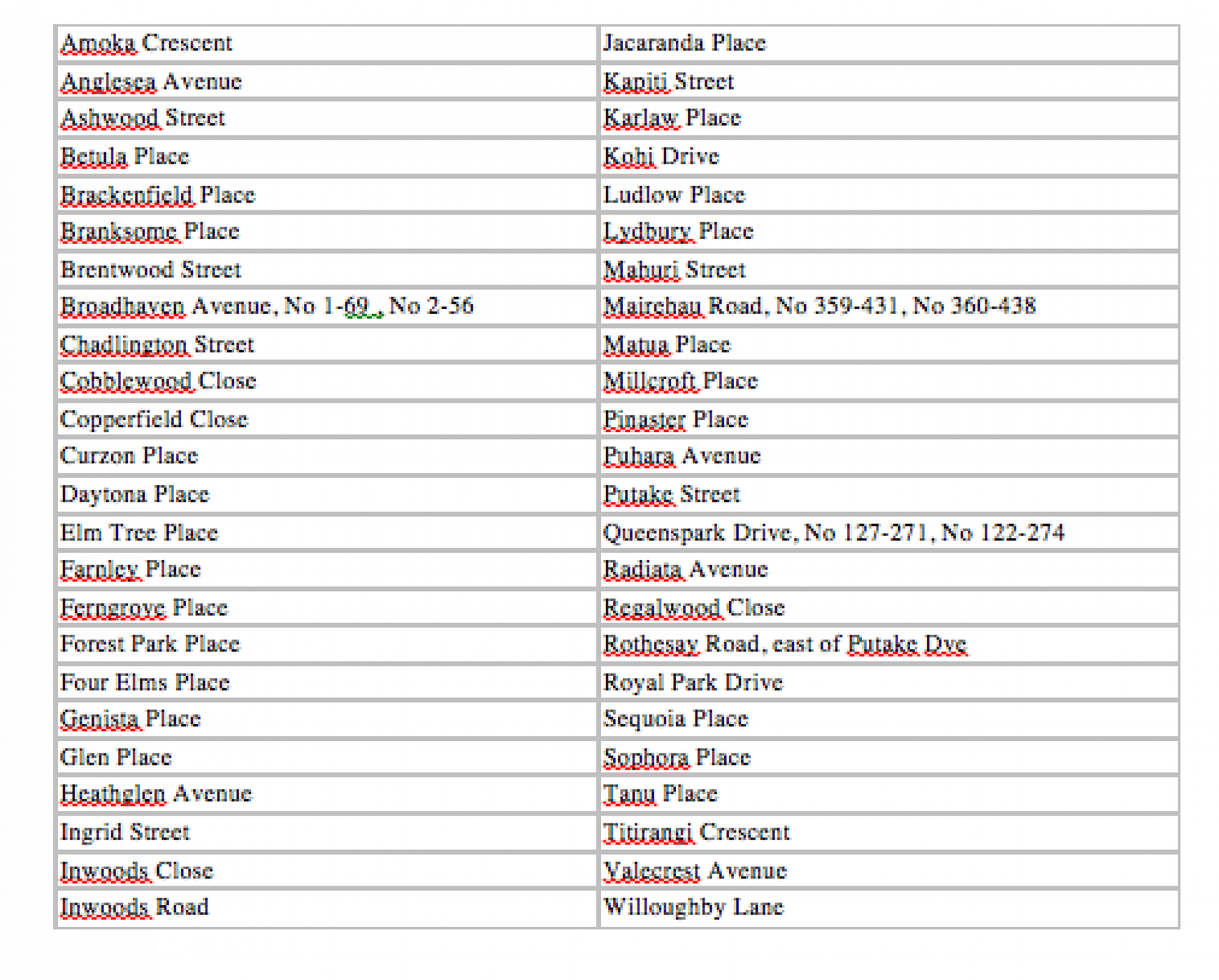 The zone commences at the intersection of Putake Drive and Mairehau Road then traveling east – including both sides of Mairehau Road and all properties in Daytona, Curzon and Karlaw Places – up to the intersection with Inwoods Road, then turning north along Inwoods Road across Queenspark Drive – including both sides of Inwoods Road (excluding Jade and Arosa Place) – up to the intersection with Broadhaven Avenue, crossing Broadhaven Avenue and traveling around Inwoods Close – including both sides of Inwoods Close, then returning to Broadhaven Avenue and traveling west – including both sides of Broadhaven Avenue – to the intersection with Anglesea Avenue, then turning north along Anglesea Avenue across Forest Drive – including both sides of the road – to the intersection with Millcroft Place, then traveling around Millcroft Place – including both sides of Millcroft Place. The home zone will then meet Queenspark Drive up to Rothesay Road and then continue along the south side of Rothesay Road to Putake Drive, turning south and travelling to Mairehau Road (including Amoka Crescent and Tanu Place).