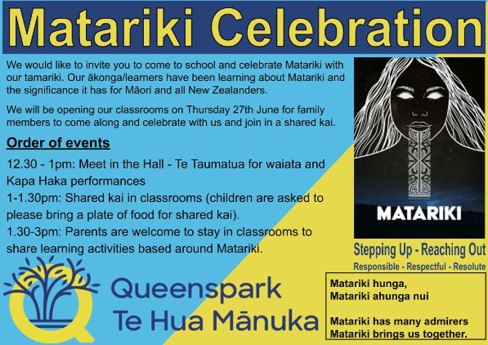 We will be meeting in Te Taumatua our school hall at 12:30 Thursday 27 June for waiata and a kapa haka performance before heading back to our learning spaces for shared kai then Matariki themed activities. Come along. We look forward to seeing you on this day.