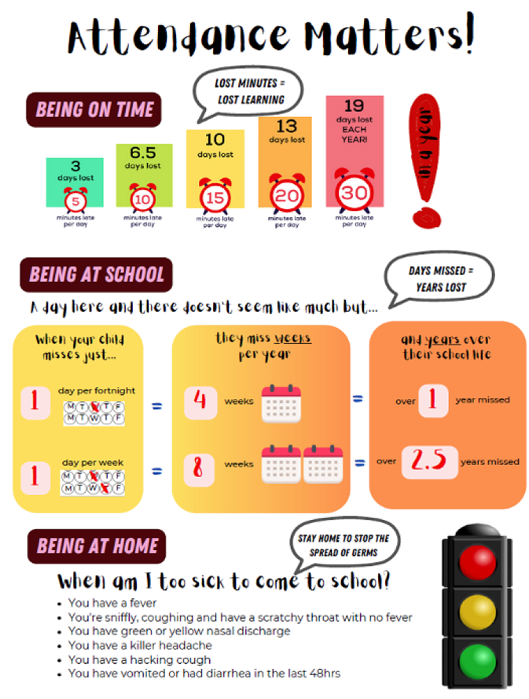 If a student misses one day of school every two weeks, they miss more than a whole year of school by 16 years of age! As a parent or caregiver, you, alongside our school, play a key role in building strong habits of regular school attendance.