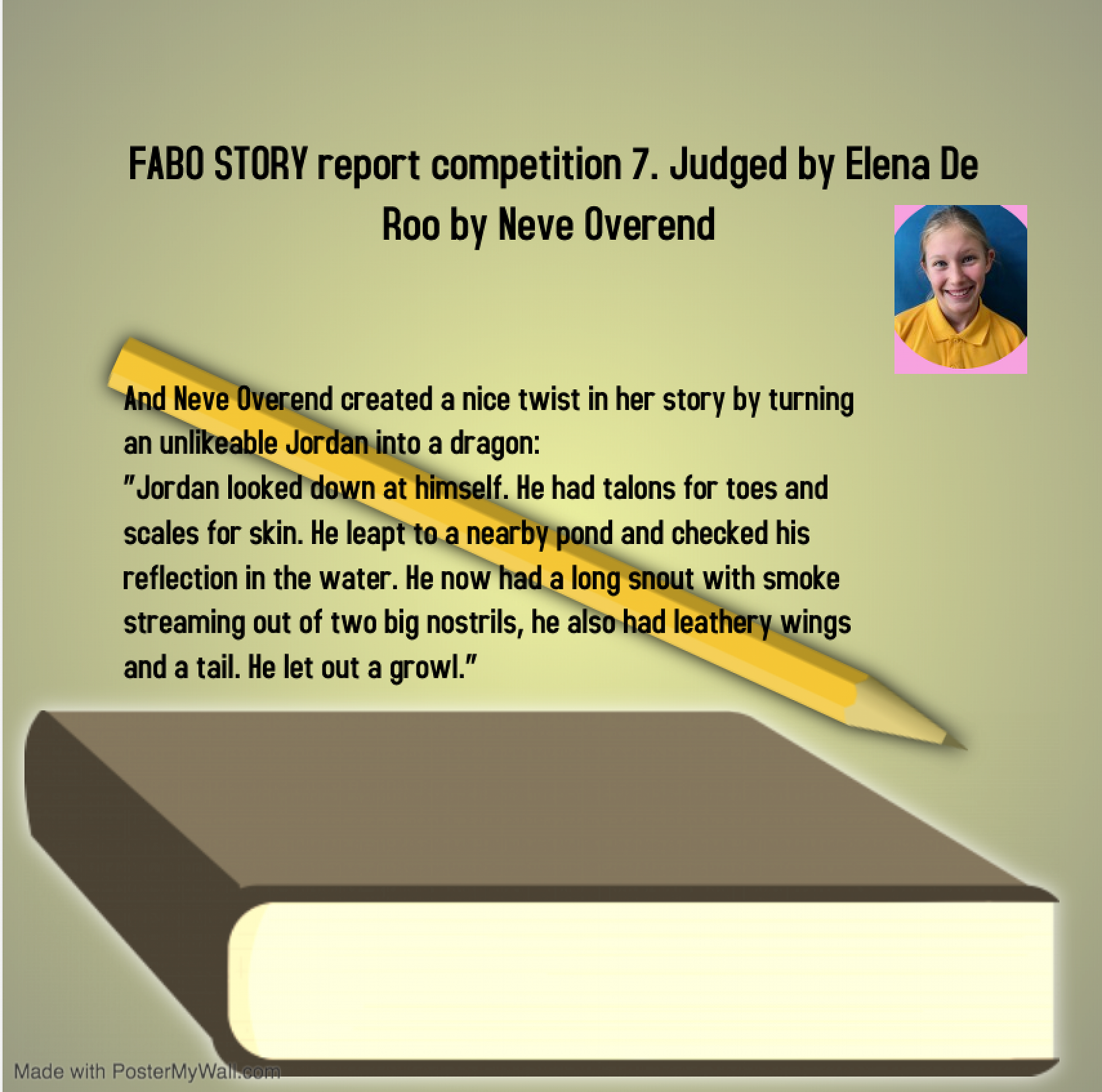 Neve has been participating in the National FABO Story Writing competition for the last 2 months. She has had special mentions a few times for her fantastic writing! Here is one of her recent Special Mentions and a piece from her last writing