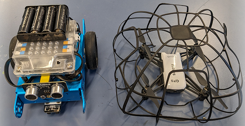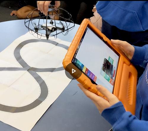After 2 weeks of programming mBot robots on the ground, the year 6 students have moved on to programming Tello drones using the Droneblocks code language to fly around inside Room 11.