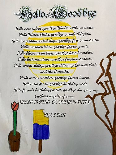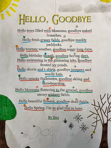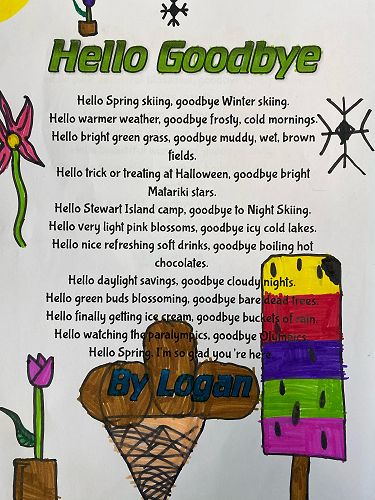 Room 29 have written Hello Goodbye poems to celebrate Spring arriving. Here are a couple of examples of our mahi from this week.