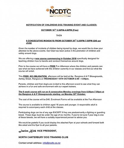 The NCDTC are offering a free fun afternoon for parents and their tamariki to tell them about the courses to educate everyone about their own safety regarding dogs. Given the number of incidents involving children and dogs these classes are a great idea.