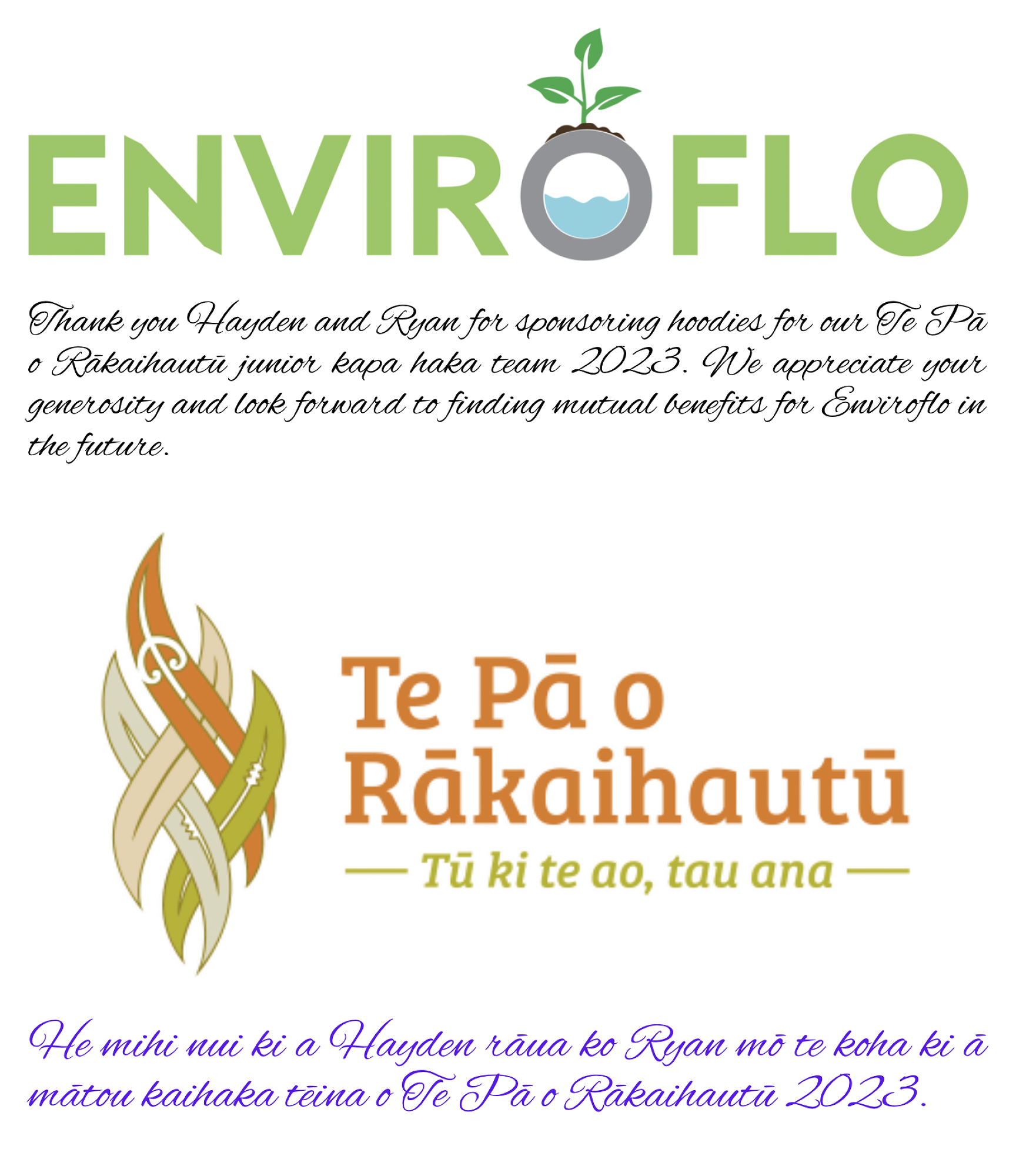 - Enviroflo business partners Hayden Greig & Ryan Gebbie generously sponsored hoodies for our Te Pā o Rākaihautū kaihaka who represented Waitaha at Te Mana Kuratahi National Primary Schools Kapa Haka held in Whakatū/Nelson 2023.