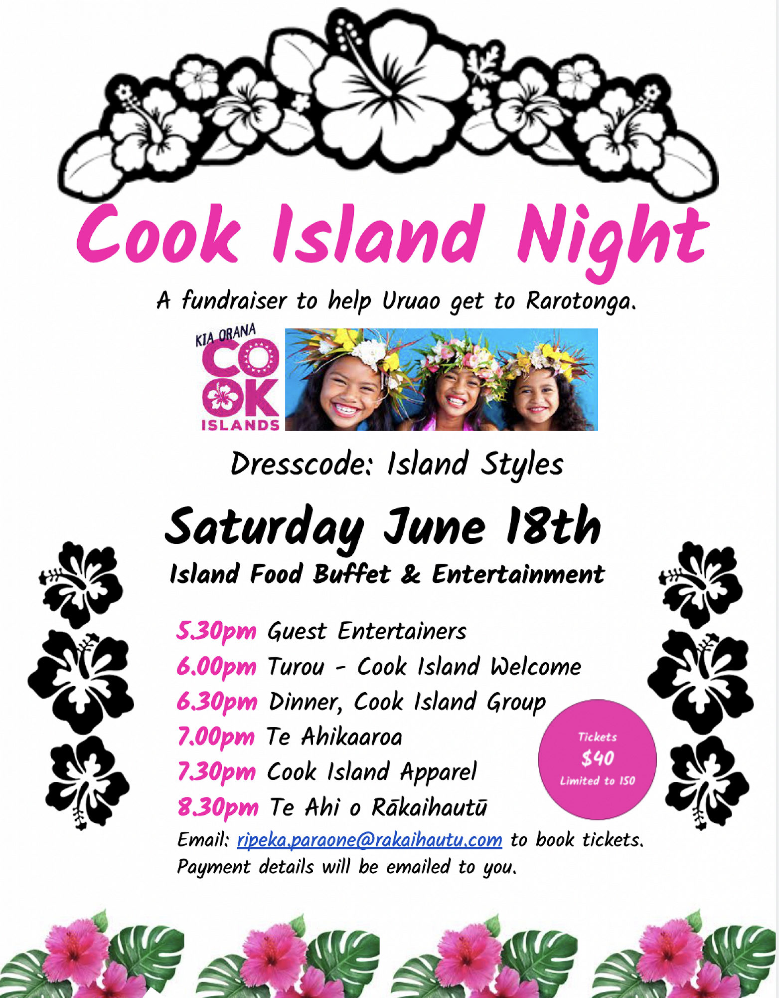 On Saturday June 18th the group fundraising to travel to Rarotonga will host 150 guests in Rapanui (the hall) at Te Pā o Rākaihautū. The entertainment starts at 5.30pm.