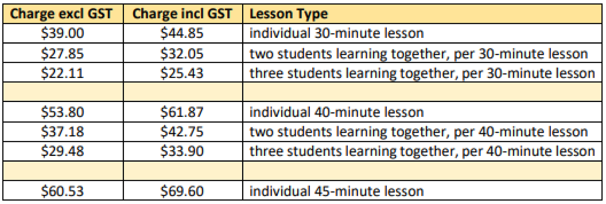 For 2024 lessons are charged at $78.00 per hour. Those tutors who are registered for GST will have a GST component included as well.