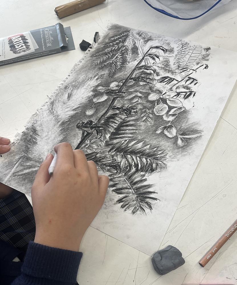 Year 11 students are continuing their journey with charcoal drawings. This phase of their art making is focused on mastering the use of tone and shade, allowing them to experiment with the dramatic effects of light and dark. This method broadens their pathways for artistic expression and allows ākonga to hone their skills and enhance their understanding of visual contrast. This lays a solid foundation for their future artistic endeavours. Students have a drypoint print to complete ready printing in their first double period next term.