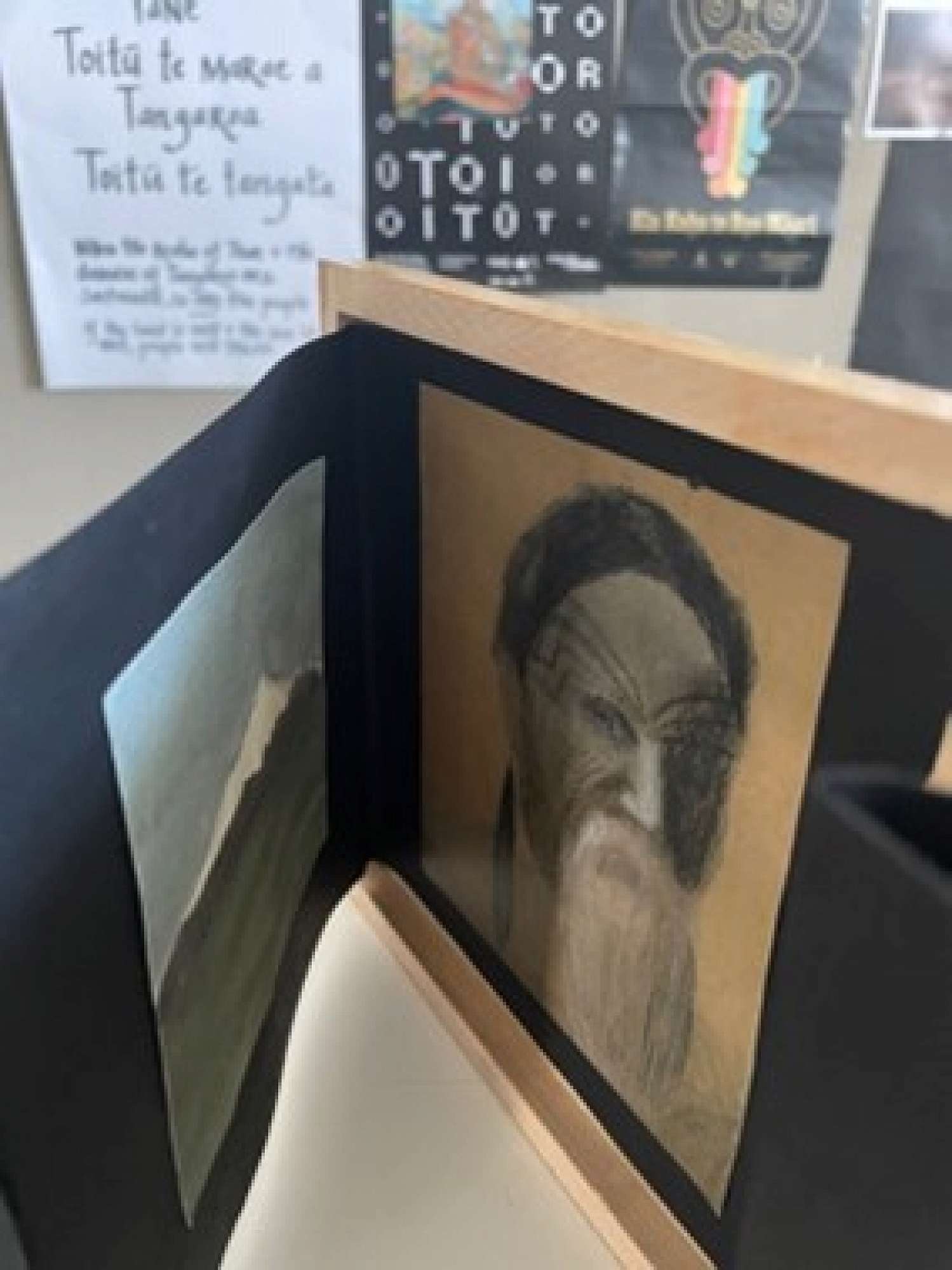 Taonga tuku iho – treasures from ancestors provide principles by which to live our lives. Ākonga develop bodies of learning based on tuakiri - identity, their whakakpapa - geneology, their sense of tūrangawaewae, or develop visual mihi, making artworks of people or places of significance to them, informed by their cultural identity. Māori students are encouraged to enter Ringa Toi Student Exhibition and Kiingi Tuhetia Portraiture Award and have had great success with Rangi Ruru ākonga being selected for both awards and SCAPE Public Art.