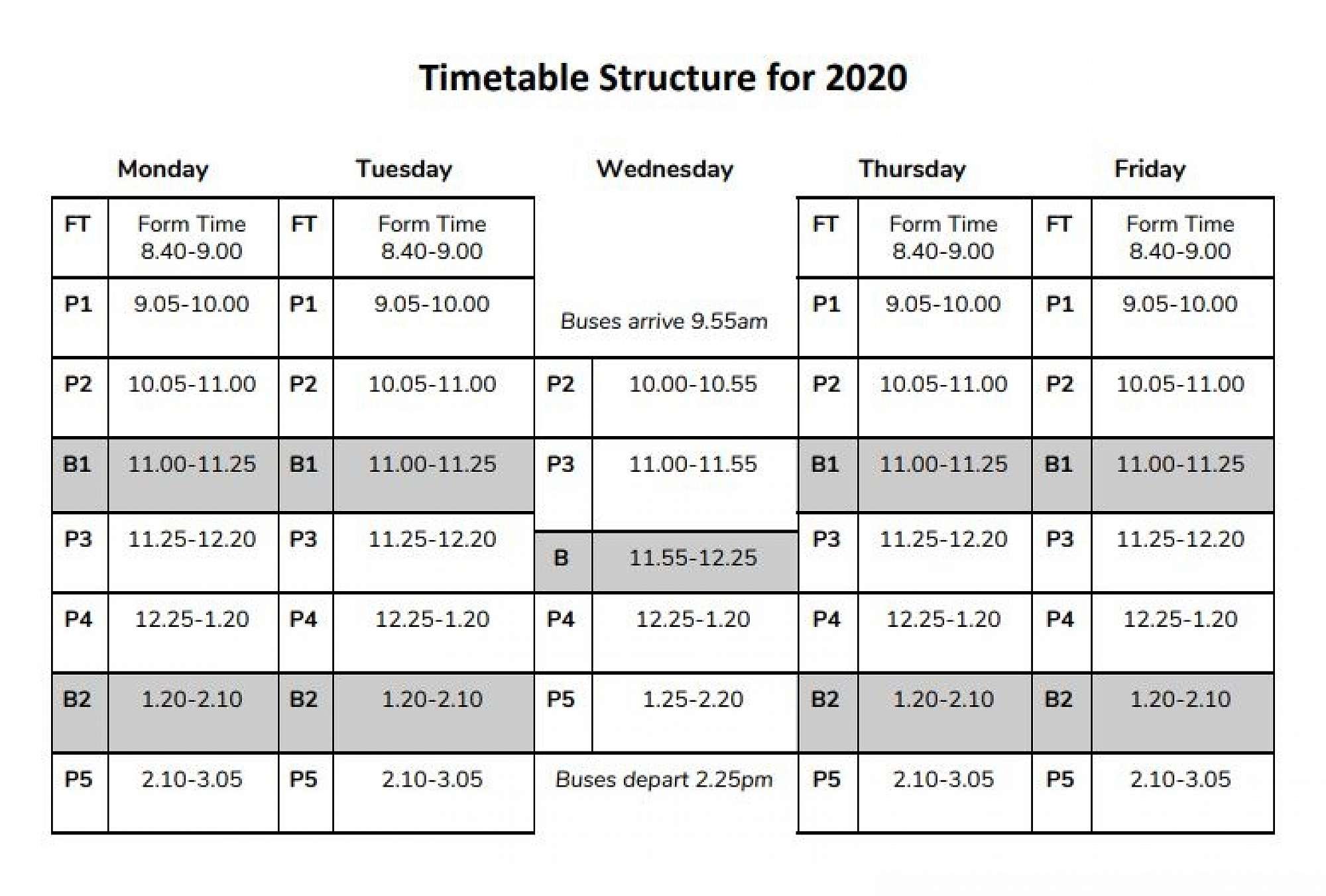 The exception to the above is Wednesday when there is no form time as staff are involved in Professional Learning meetings. School starts later on Wednesdays. Buses run approximately 80 minutes later (arriving just before 10.00am). On Wednesdays, lessons begin at 10.00am and the school day ends at 2.20pm, with one break.
