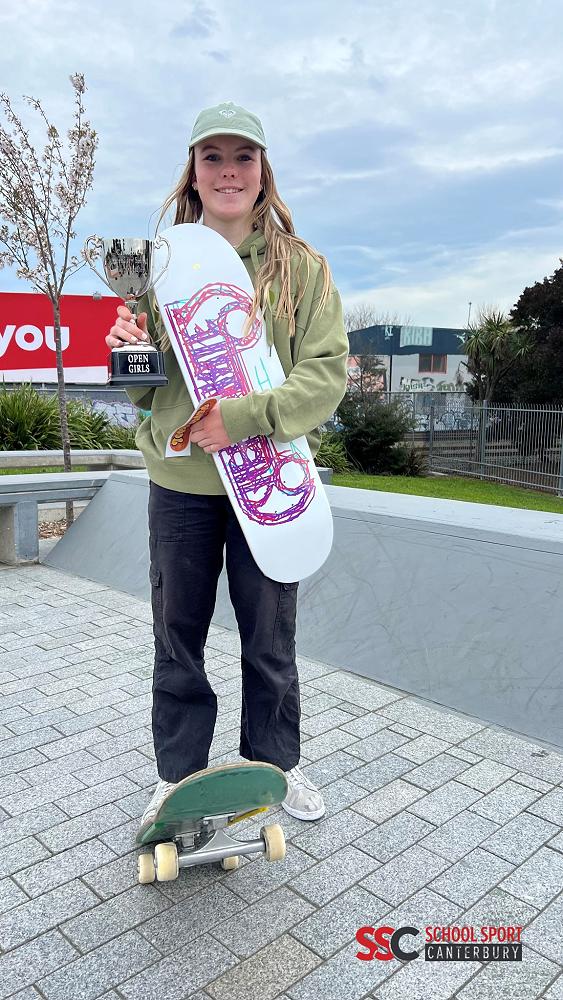 Our student Phoebe Chatterton was the Open Girls' grade winner at the recent Cheapskates Skate Skool Canterbury Secondary Schools Skate Championship. You can read all about Phoebe in the School Sport Canterbury article.