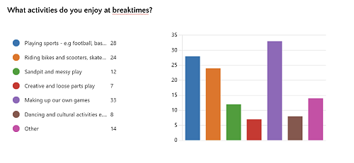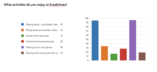 You can see from the data that most of our year 5-8 students enjoy playing sports and making up their own games during breaktimes. Our junior students enjoy making up their own games, playing sport and riding their scooters or bikes.
