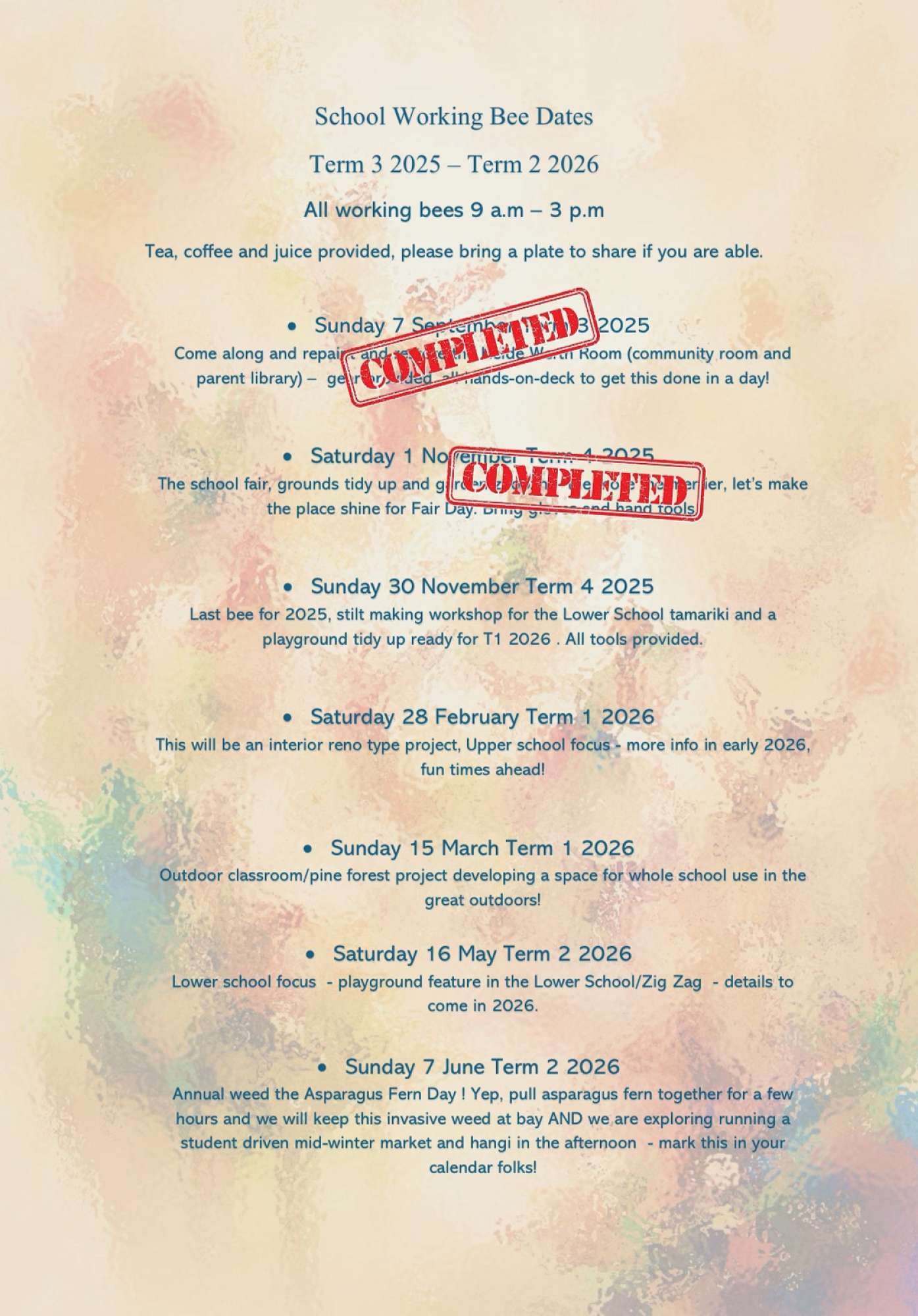 Coming along to our working bees helps in strengthening our community by creating lasting memories and connections whilst keeping our school beautiful! Please make sure to save these dates into your calendar so you don't miss out on joining in!