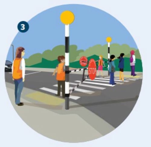 Once the kea crossing has been set up, it needs to operate quickly, smoothly and efficiently to minimise traffic disruptions and delays. Any pedestrian waiting to cross must stand well back from the STOP sign so that the patrol members have a clear view of the road. The patrol member positioned at the kindergarten roadside is the leader for calling the kea crossing commands.