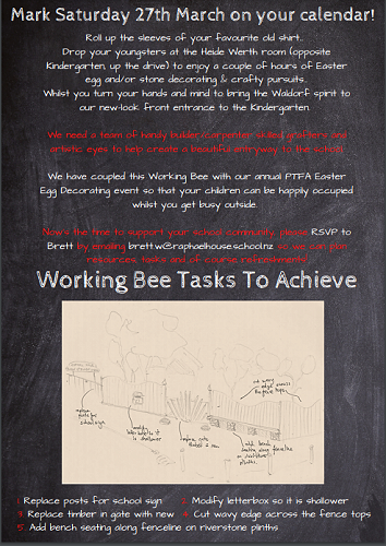 On Saturday 27 March 9am - 1pm. Come along for any amount of time you can spare between these hours. Bring the whole family for this egg decorating and working bee event.