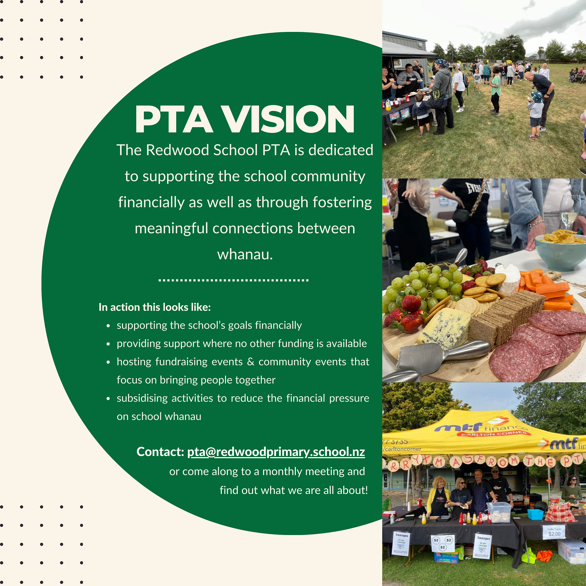 We have recently updated our Vision Statement: The Redwood School PTA is dedicated to supporting the school community financially as well as through fostering meaningful connections between whānau