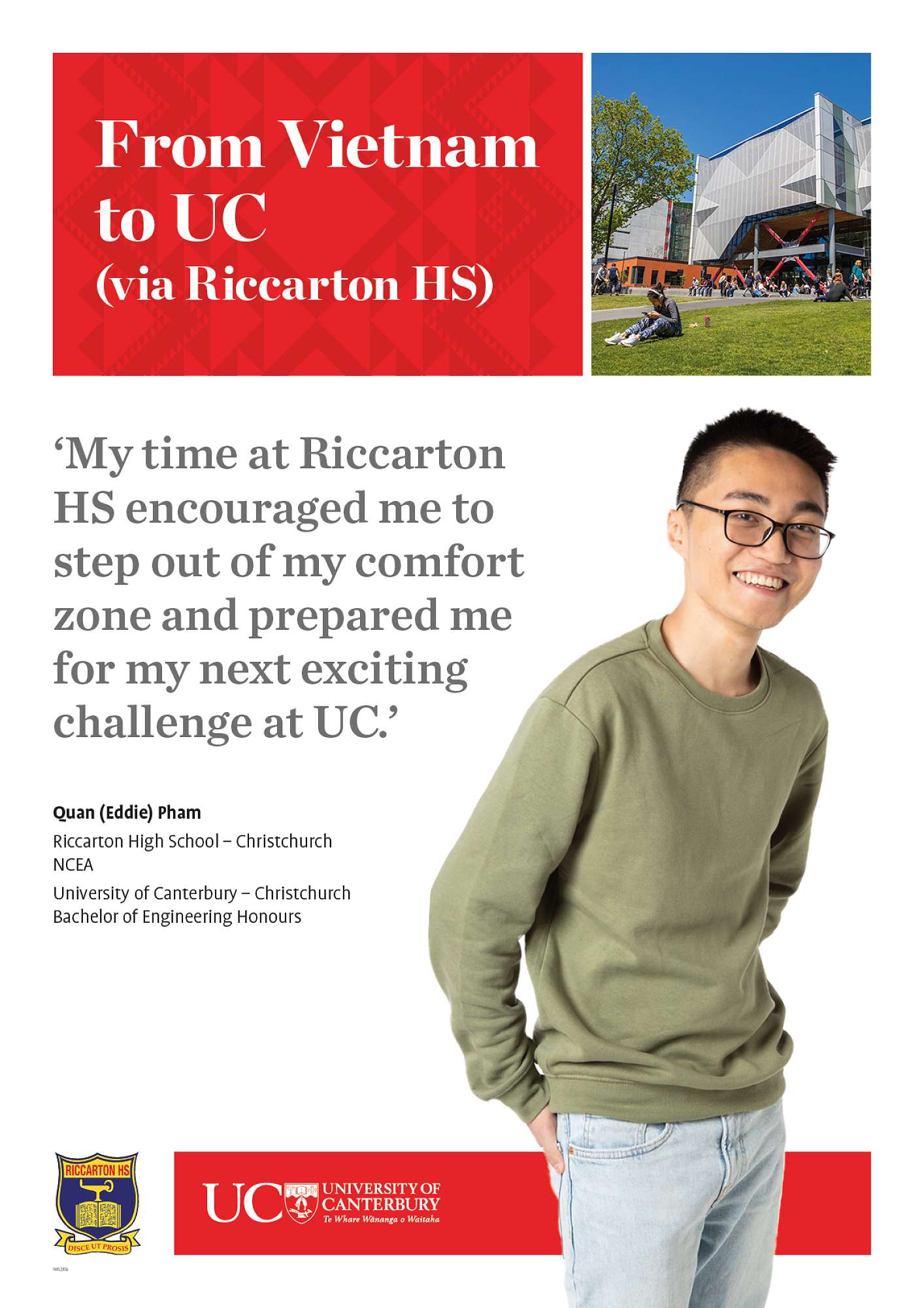 Eddie Pham, an international student from Vietnam, who is now in his second year of a BEHons at University of Canterbury, was celebrated on a UC poster where he said that “RHS encouraged him to step out of his comfort zone and prepared him for his next exciting challenge at UC”.