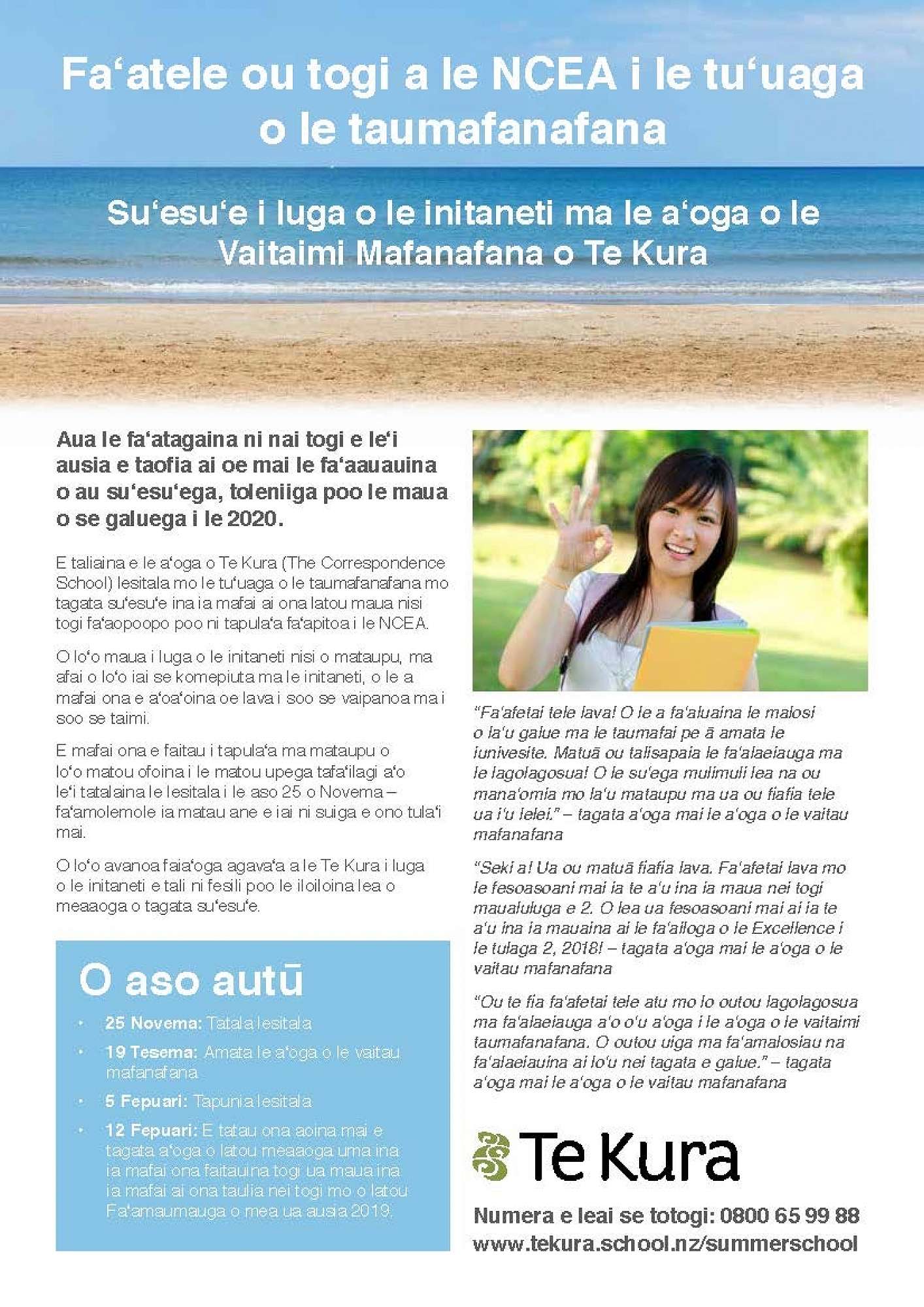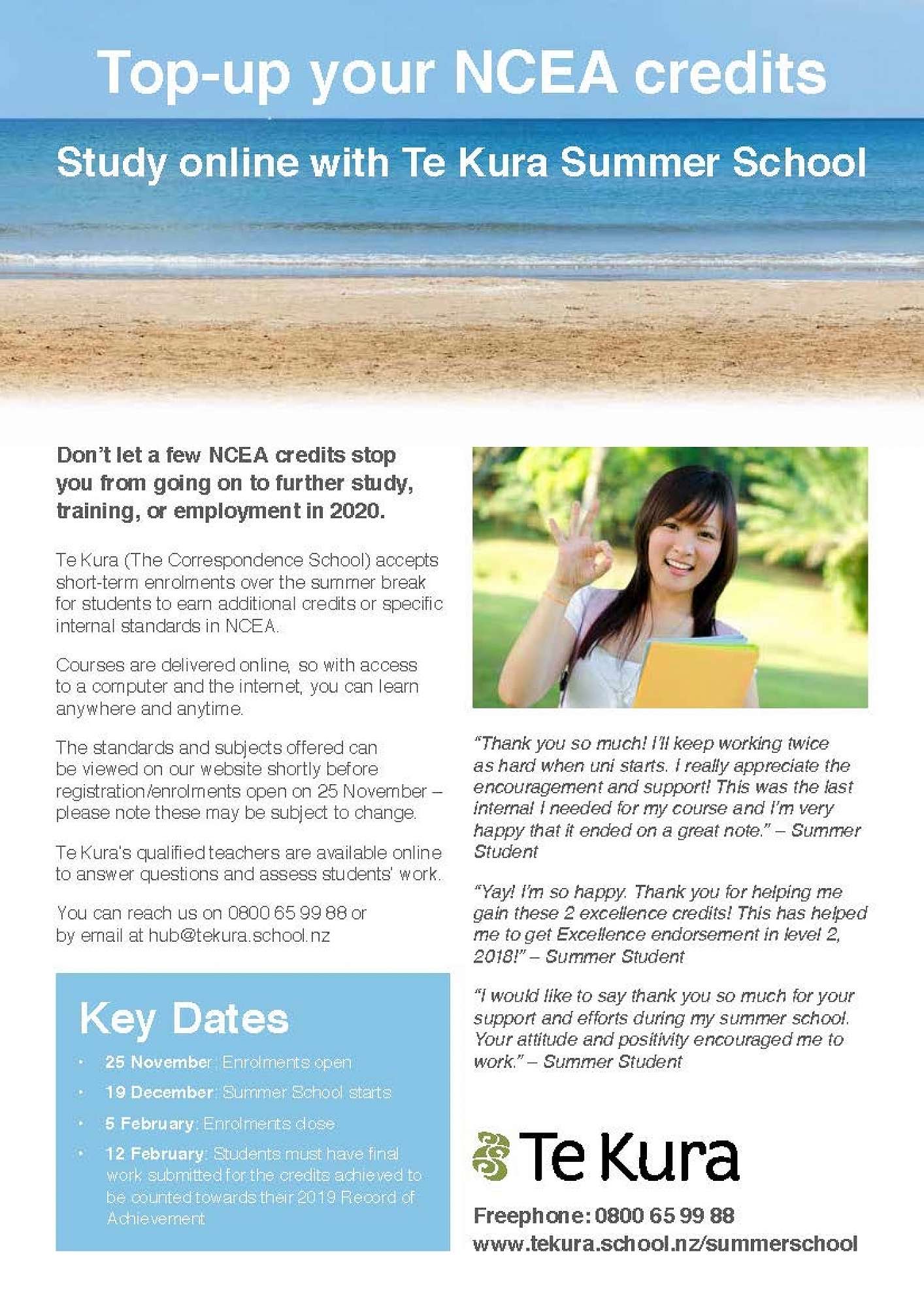 This is the fifth year that Te Kura have offered summer study, which has grown in popularity every year. More than 1500 students took advantage of Summer School last year to top up their NCEA credits, enabling them to go on to either further study, training or employment.