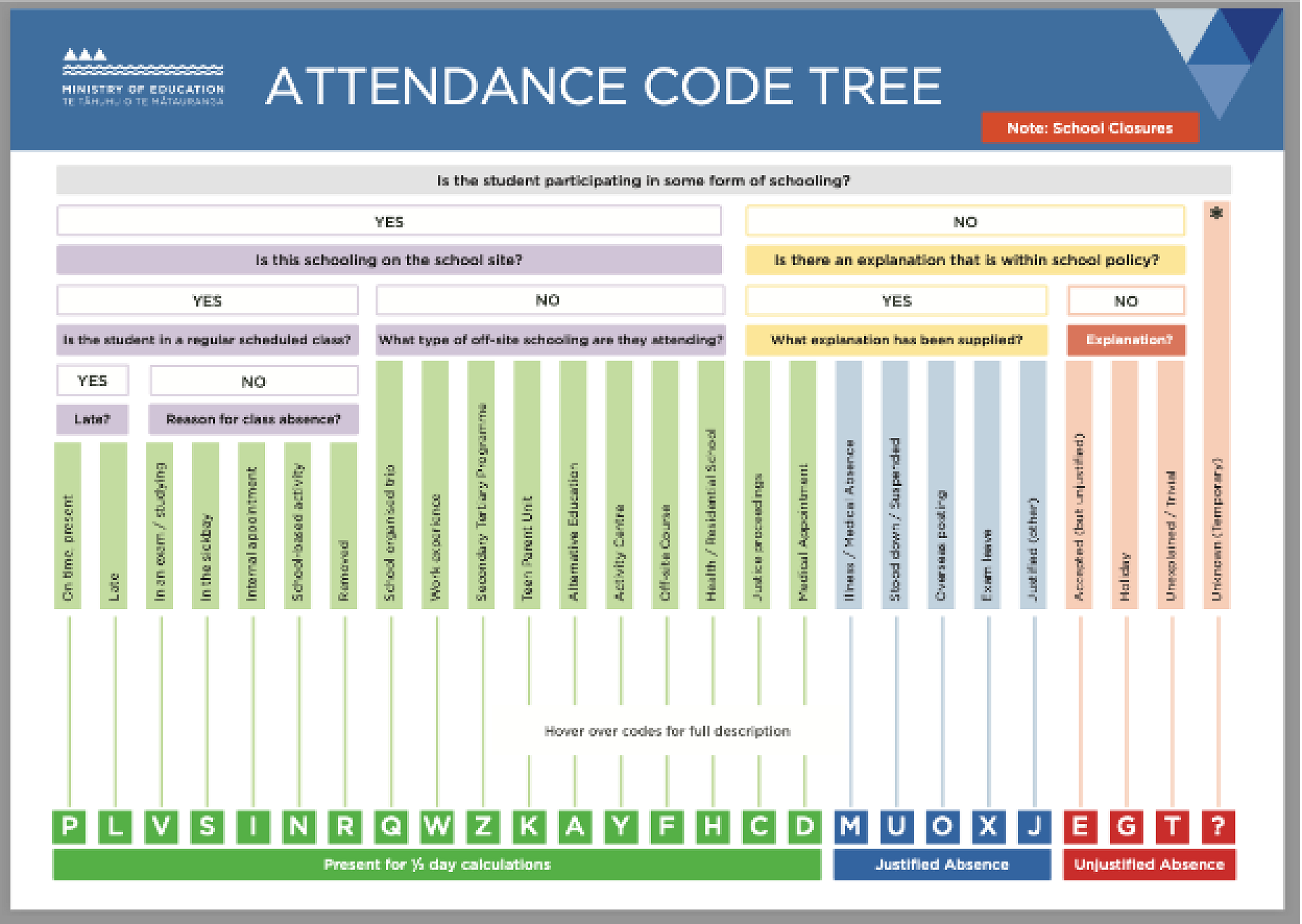 Please see the Ministry of Education attendance codes that a school is required to use below. As a parent you will see the codes ‘P (present)’, ‘J (Justified)’ or ‘U (unjustified)’ on the portal. These correspond to the categories below.