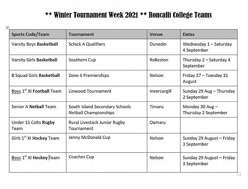 - Senior A Netball Team: South Island Secondary Schools Netball (Timaru) Monday 30 August - Thursday 2 September