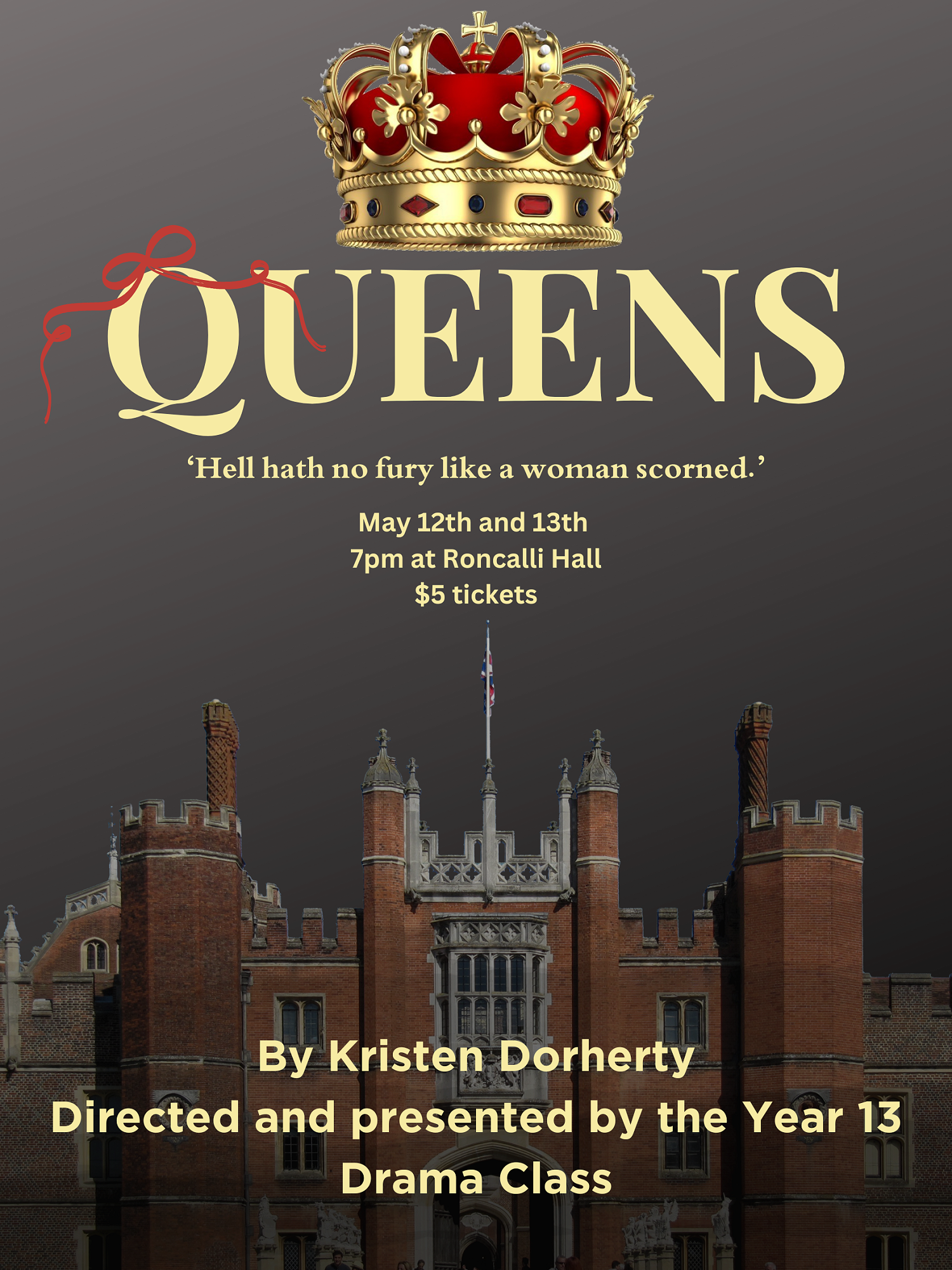 The Year 13 Drama Class present their production assessment of 'Queens' by Kristen Doherty. Please note some heavy themes within the script, so it is intended for a more mature audience- recommendation of 16 years.