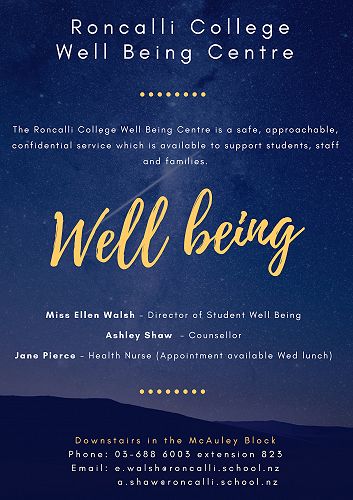 The Roncalli College Well Being Centre will be closed over the holiday break and will reopen on Monday 12 October.