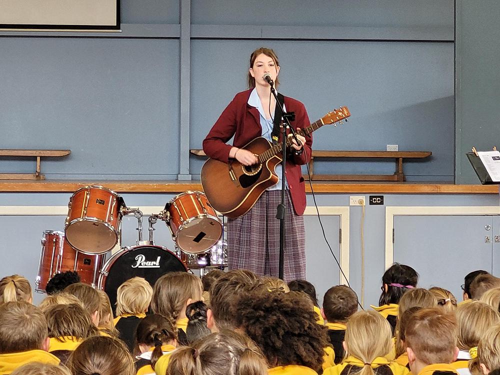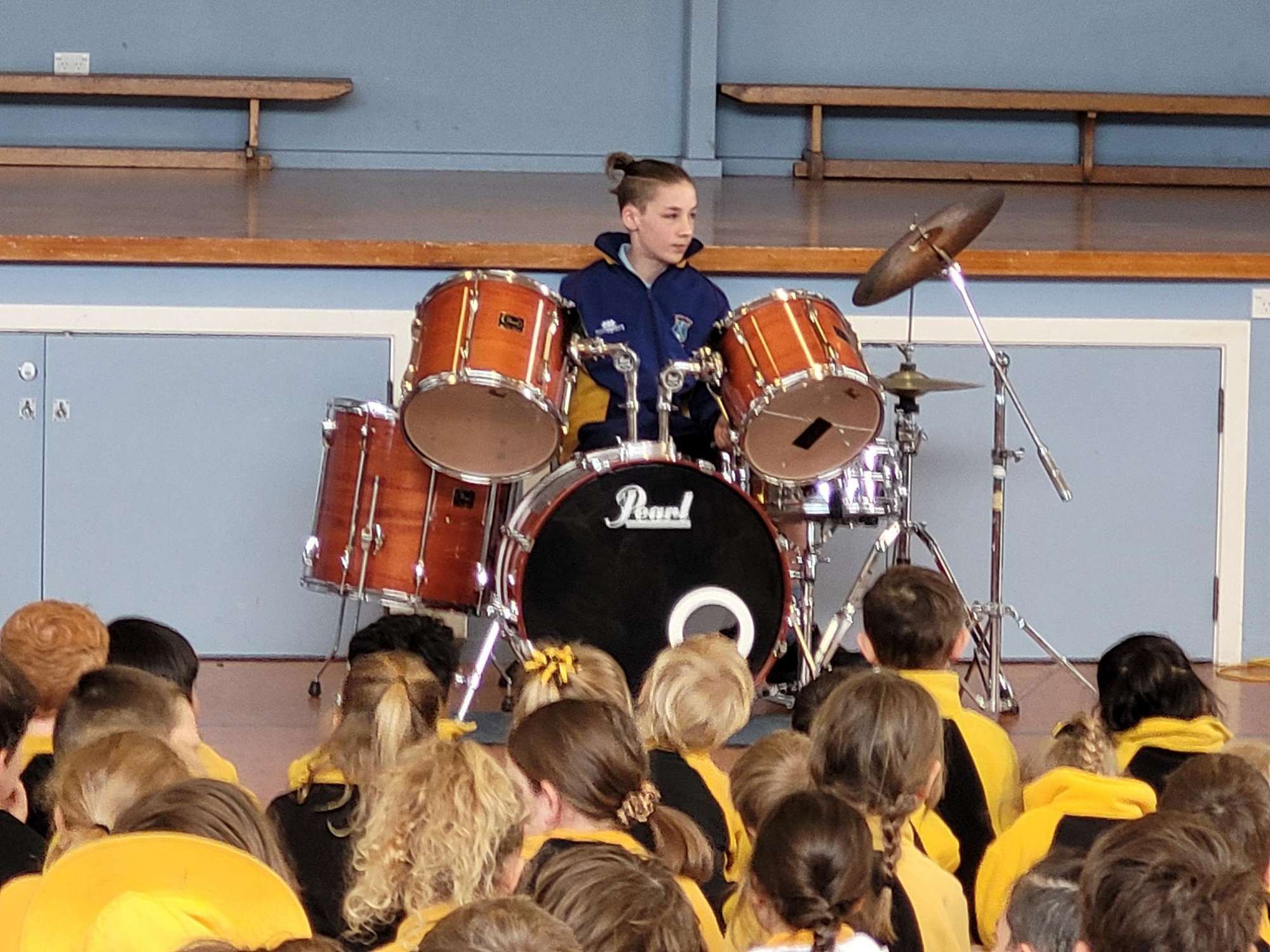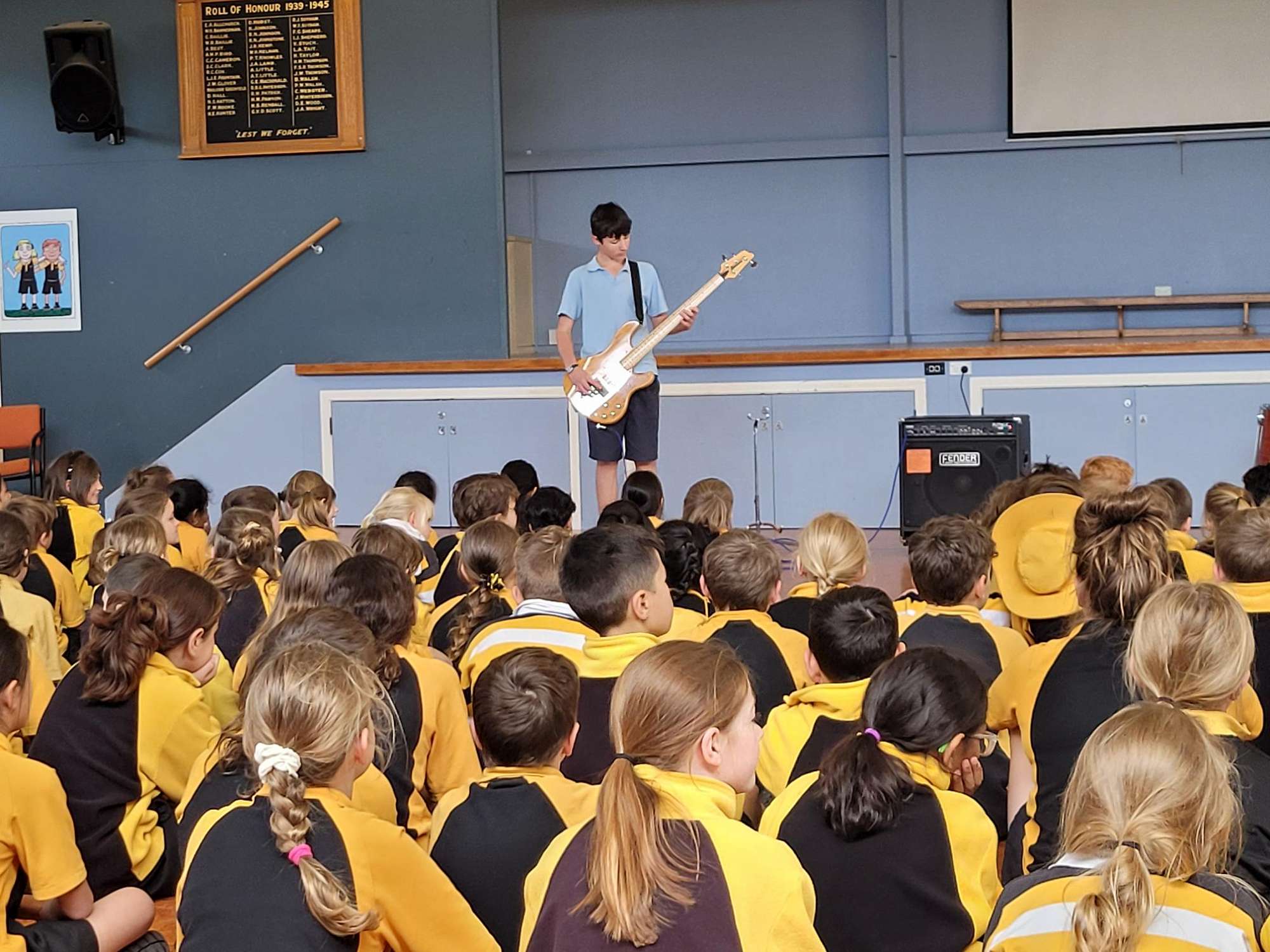 At a performance for Waimataitai School, Zac Campbell and Reuben Wheeler had the students groove to performances on bass guitar and drum kit.