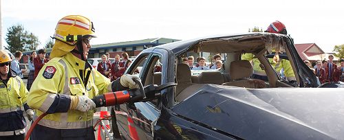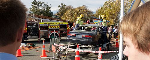 The crumpled and disfigured metal not only gave students and staff an early morning wakeup, but when the girls arranged for the Timaru Fire Service to put their grinders and jaws of life to work at lunchtime, the sparks tearing at the alloy flesh and the wrenching metal screeching in pain became a vivid display to help students think three times whilst at the wheel.