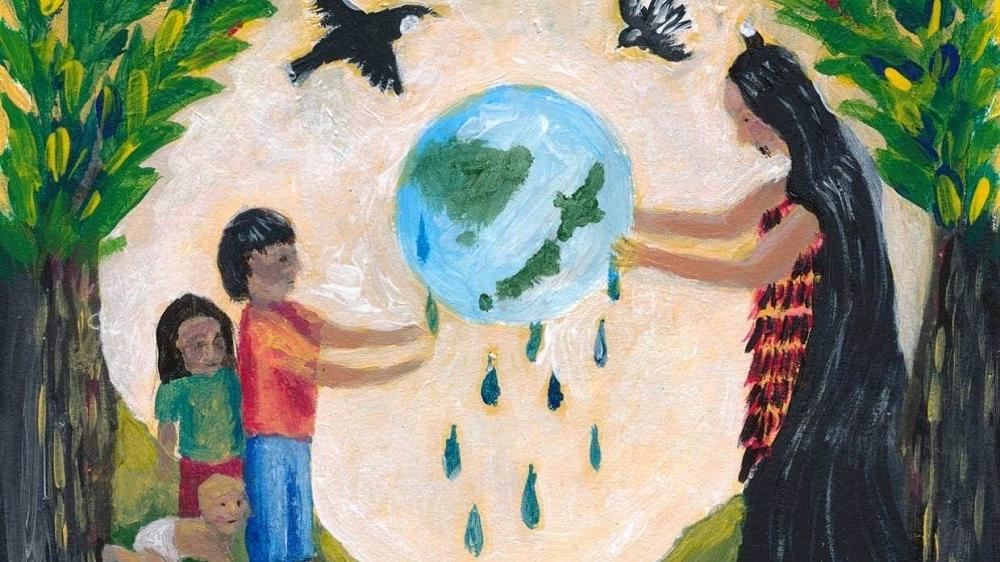 As reported in the Timaru Herald article (linked here) this week, Maevi's depiction of Papatūānuku (earth mother) handing the land to tamariki has won the intermediate section of a national art competition.