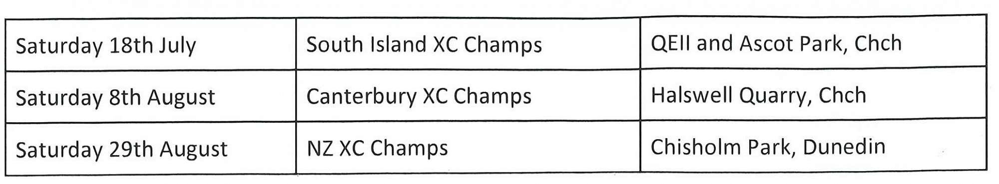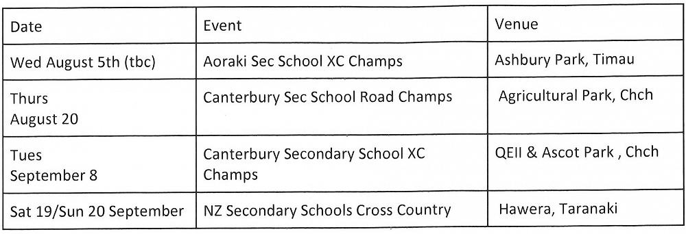 We have identified the following school based events this season leading up to the New Zealand Secondary Schools Cross Country Championships (NZSSXC) in Hawera on 19th September, to which we will be taking a team.