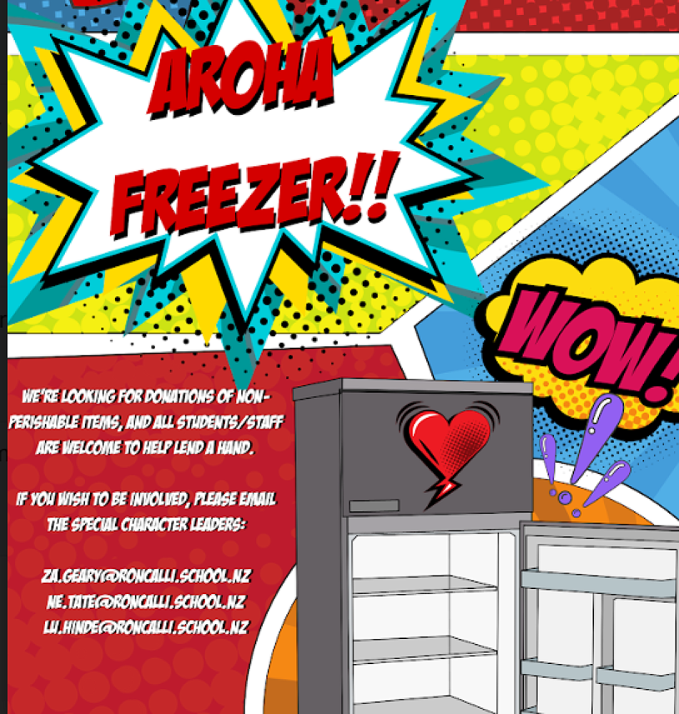 If you would like to contribute any non-perishable item of food (flour, sugar, cans of food or fruit) vegetables, or a grocery voucher or meat to be used to create meals please contact Sally Betts on s.betts@roncalli.school.nz or one of our Special Characters leaders Lucy l.hinde@roncalli.school.nz, Nelly n.tate@roncalli.school.nz, or Zannyx z.geary@roncalli.school.nz with any questions or contributions. We would be happy to accept what you can offer. Items can be left at the office. If you would like to donate your time, we would also be grateful. In the next week or two we will email out a sign up sheet should any student or parents help cook or create a meal or two after school one afternoon.