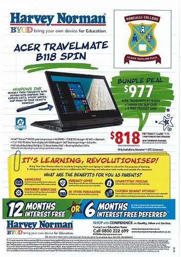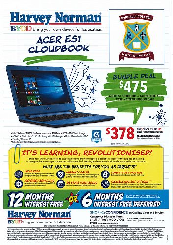 Currently the College has a relationship with Harvey Norman and has worked with them to assemble a selection of devices to meet these requirements. Please mention that you/your student is a member of the Roncalli community fo special deals. However parents and students should not be restricted to this relationship and may purchase suitable devices that meet the above criteria from their own sources.
