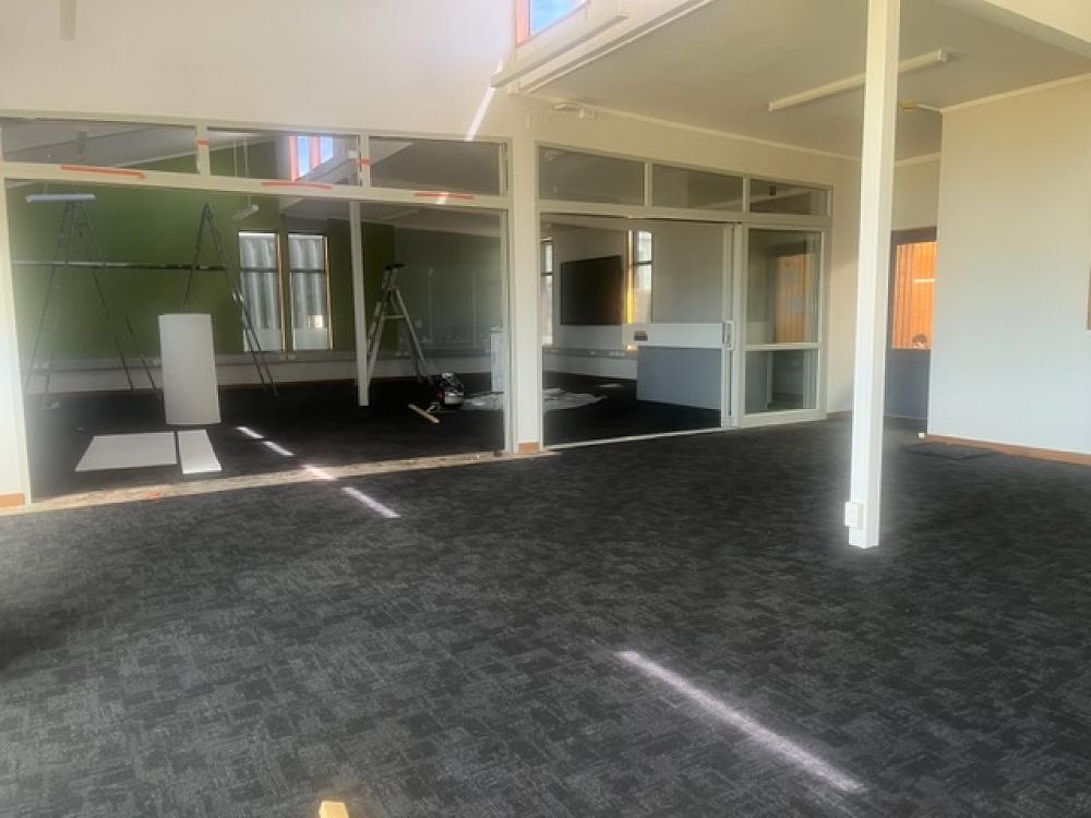 The upgraded College learning center is nearing completion. The space has been opened up into two big, bright, flexible rooms that will be able to be used for a variety of purposes. The renovation has included new carpeting, lighting, aluminum sliding doors, shades, autex, painting, and two 86” multi-media screens.